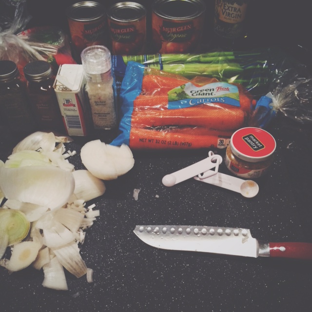 1. Saute onions and garlic in a large saucepan with a tsp of olive oil, medium heat.