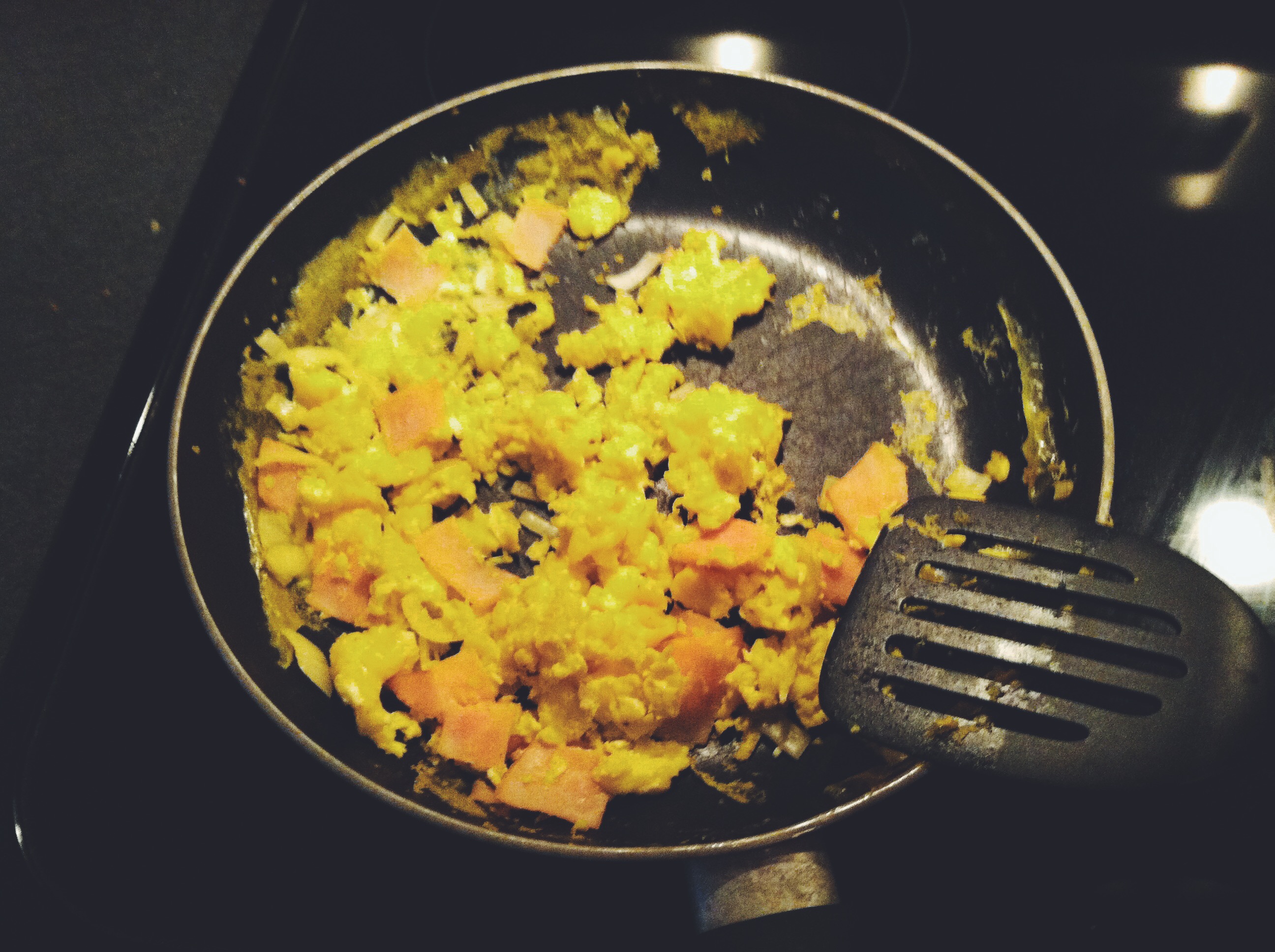 Do I need to explain how to make scrambled eggs? Grease a large pan, pour in all ingredients and cook until there is no liquid left – stirring occasionally to break up the eggs!
