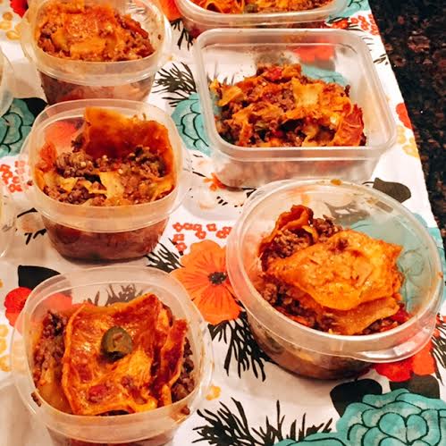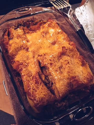 - In a large casserole dish, pour some enchilada sauce on the bottom of the pan then put down a layer of lasagna sheets. Add some meat, sauce and cheese on top of the lasagna sheet. Then repeat to create lasagna type layers until you are out of meat. Top it off with more sauce and cheese.