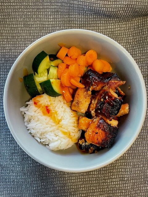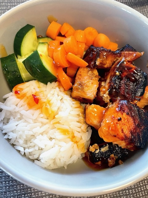 I always pair our salmon with rice. For some reason, it just makes sense. Salmon with potatoes, it’s ok. Salmon with rice, it’s delicious. I go back and forth between adding spinach and bell peppers as a side, or some crunchy delightful fresh veggies. There is something about the cool crunch of a cucumber in a rice bowl that just works.
